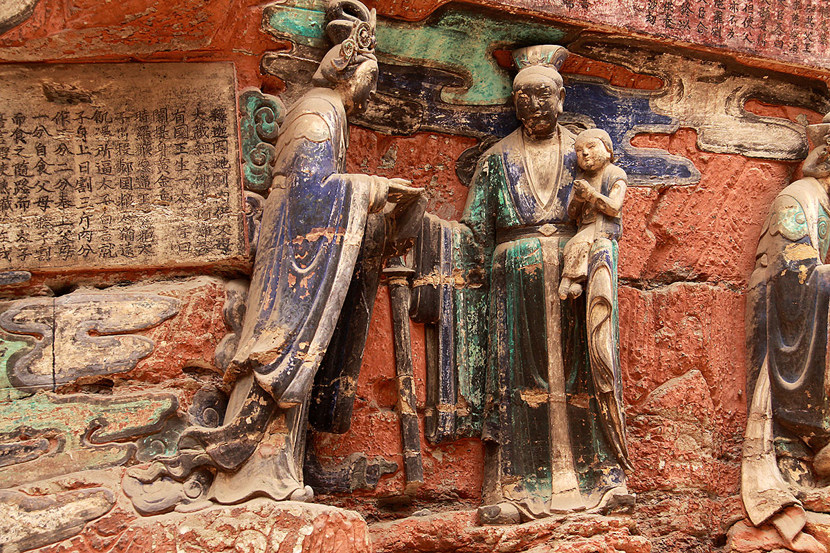 chińskich rzeźb religijnych i inskrypcji wykutych w
